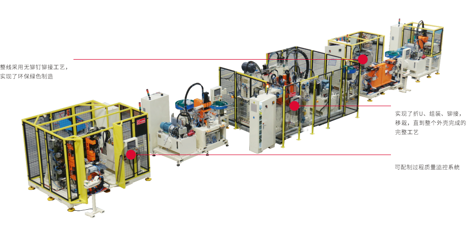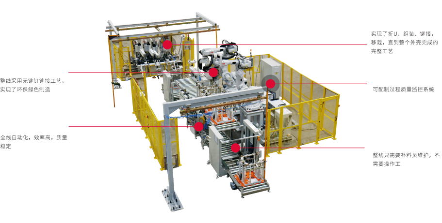 整線采用無鉚釘鉚接工藝,實現了環保綠色制造 全線自動化,效率高,質量穩定 實現了折U、組裝、鉚接,移栽,直到整個外殼完成的完整工藝。